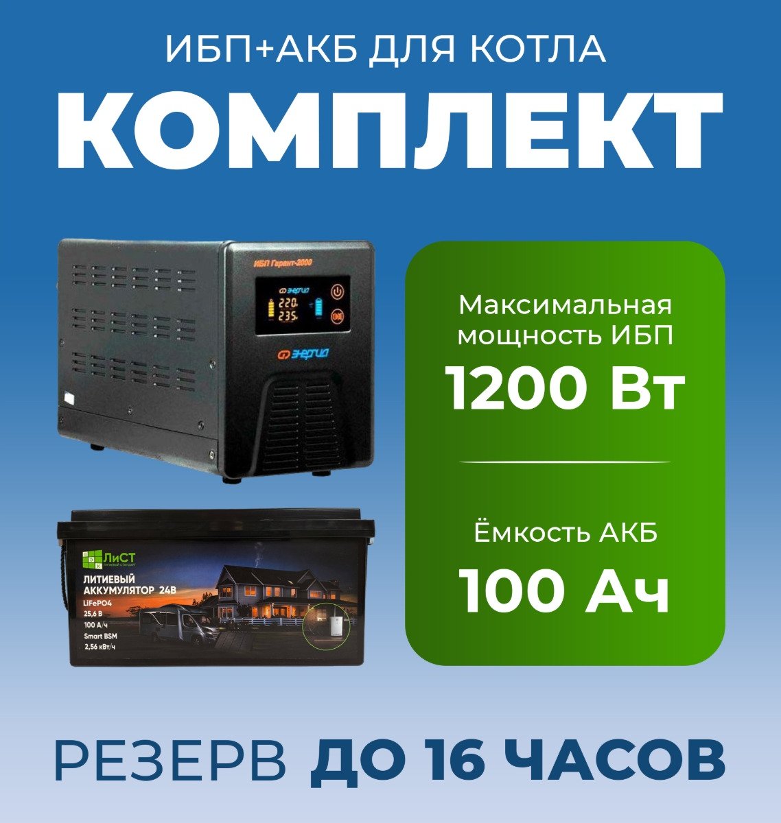 ИБП «Энергия Гарант 2000» с литиевым аккумулятором (LiFePO4) 24в 100Ач — стабильное тепло на срок до 16 часов.